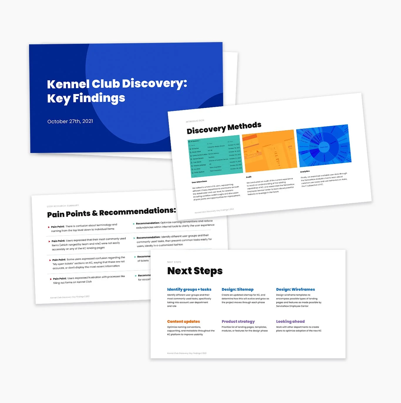 I spoke with 10+ employees from different departments and different roles within the organization to understand employee pain points and goals, and leveraged existing analytics on the backend to help determine the most common user journeys. I synthesized this discovery work into a Key Findings Report that allowed the team to move forward with a clear direction for the product.